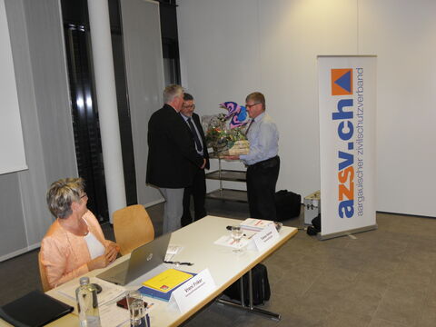 Unter dem Traktandum Ehrungen musste Beat Herzog zwei Austritte verkünden. Guido Beljean, langjähriges Vorstandsmitglied und Sektionsleiter AMB ist aufgrund seiner Pensionierung aus dem Vorstand ausgetreten. Heinz Häfliger hat sich aus gesundheitlichen Gründen entschieden, etwas kürzer zu treten und hat deshalb seine Demission als Vorstandsmitglied eingereicht. An seiner Stelle hat Ronald Rickenbacher, Kdt ZSO Wettingen-Limmattal, Einsitz im Vorstand genommen. Michael Wernli, Sektionsleiter Koordination Zivilschutz, wurde für Beljean, als neue Kontaktperson zur AMB, in den Vorstand gewählt. Im Weiteren durfte der Vizepräsident ein neues Ehrenmitglied aufnehmen; mit 40 Jahren Mitgliedschaft ist Harald Schneider wohl einer der ganz wenigen, welcher über eine so lange Zeit seinem Verband die Treue gehalten hat. Der Vorstand gratuliert Schneider zu dieser Ehrung und wünscht den beiden Austretenden alles Gute.