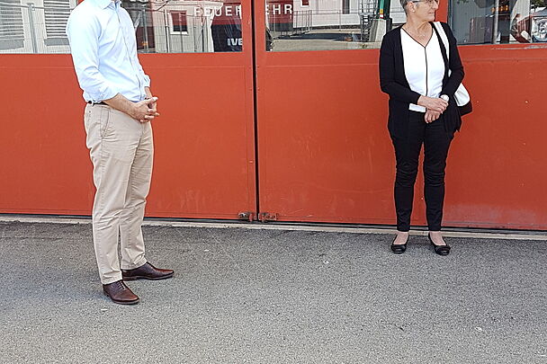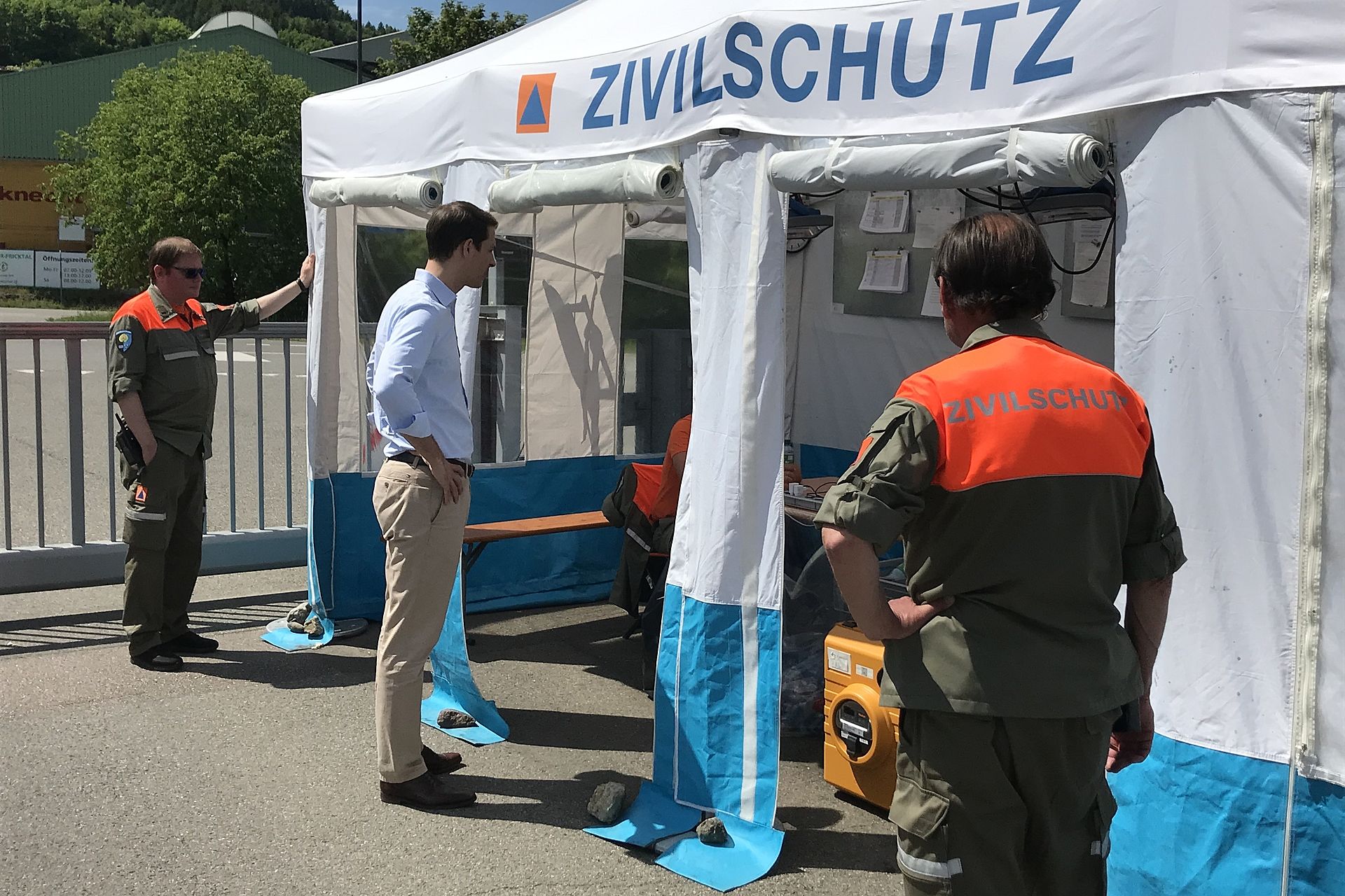 Organisiert durch den Aarg. Zivilschutzverband stattete der beliebte Politiker zuerst der ZSO Oberes Fricktal einen Besuch ab. Diese Organisation steht seit Beginn der ausserordentlichen Lage unter dem Kommando von Raphael Lémble im Einsatz und betreut auf dem Areal des alten Werkhofs in Frick Covid-19-infizierte Asylbewerber, welche aus dem ganzen Kanton für Quarantänemassnahmen zugeführt werden. Der Einsatz dauert rund um die Uhr während sieben Tagen in der Woche und umfasst nebst einer strikten Zutrittskontrolle auch die gesamte Verpflegung aus der eigenen Küche. Über die getroffenen Vorsichts- und Hygienemassnahmen konnte sich Thierry Burkart auch beim Mittagessen ein eigenes Bild machen, ehe die Reise weiterging nach Rheinfelden.