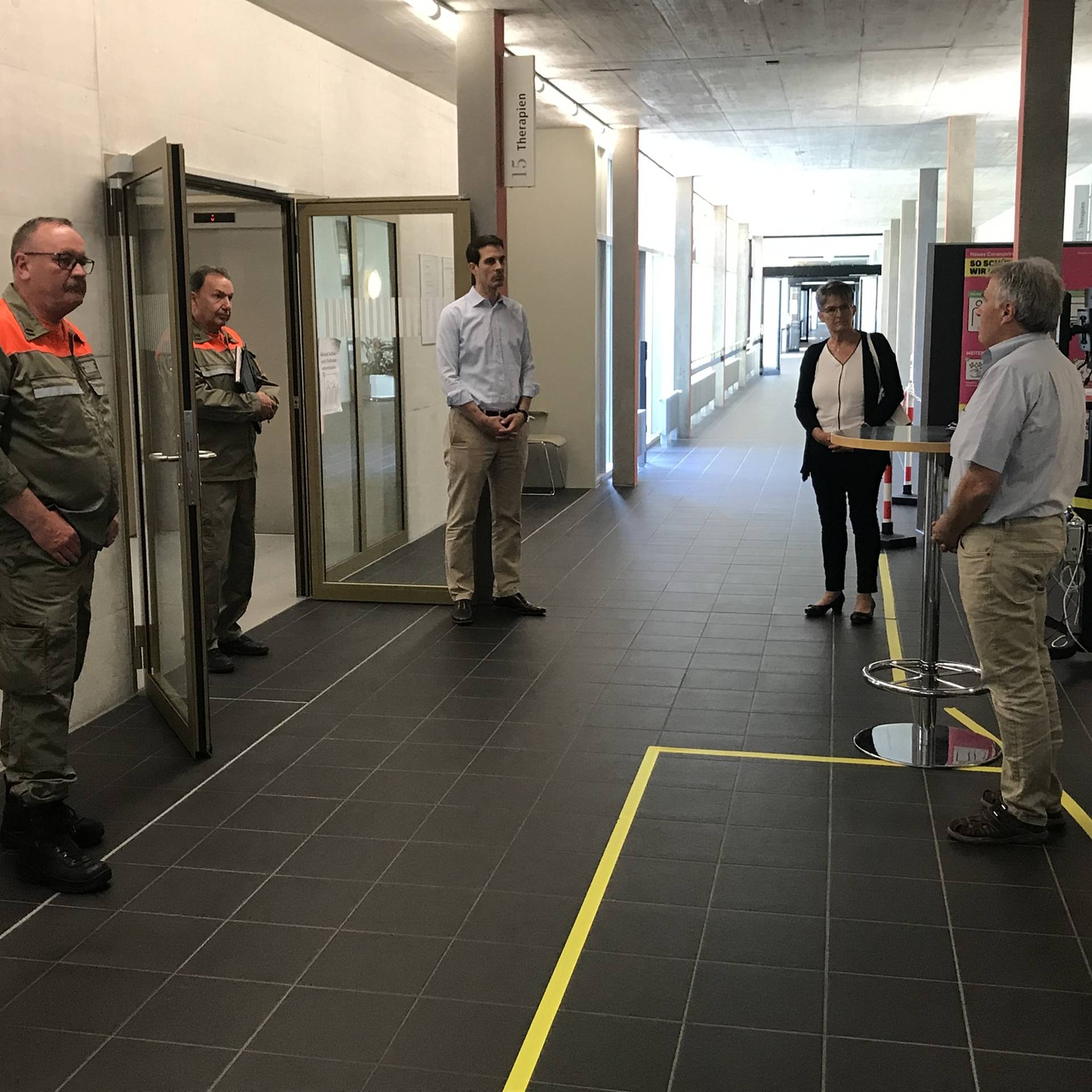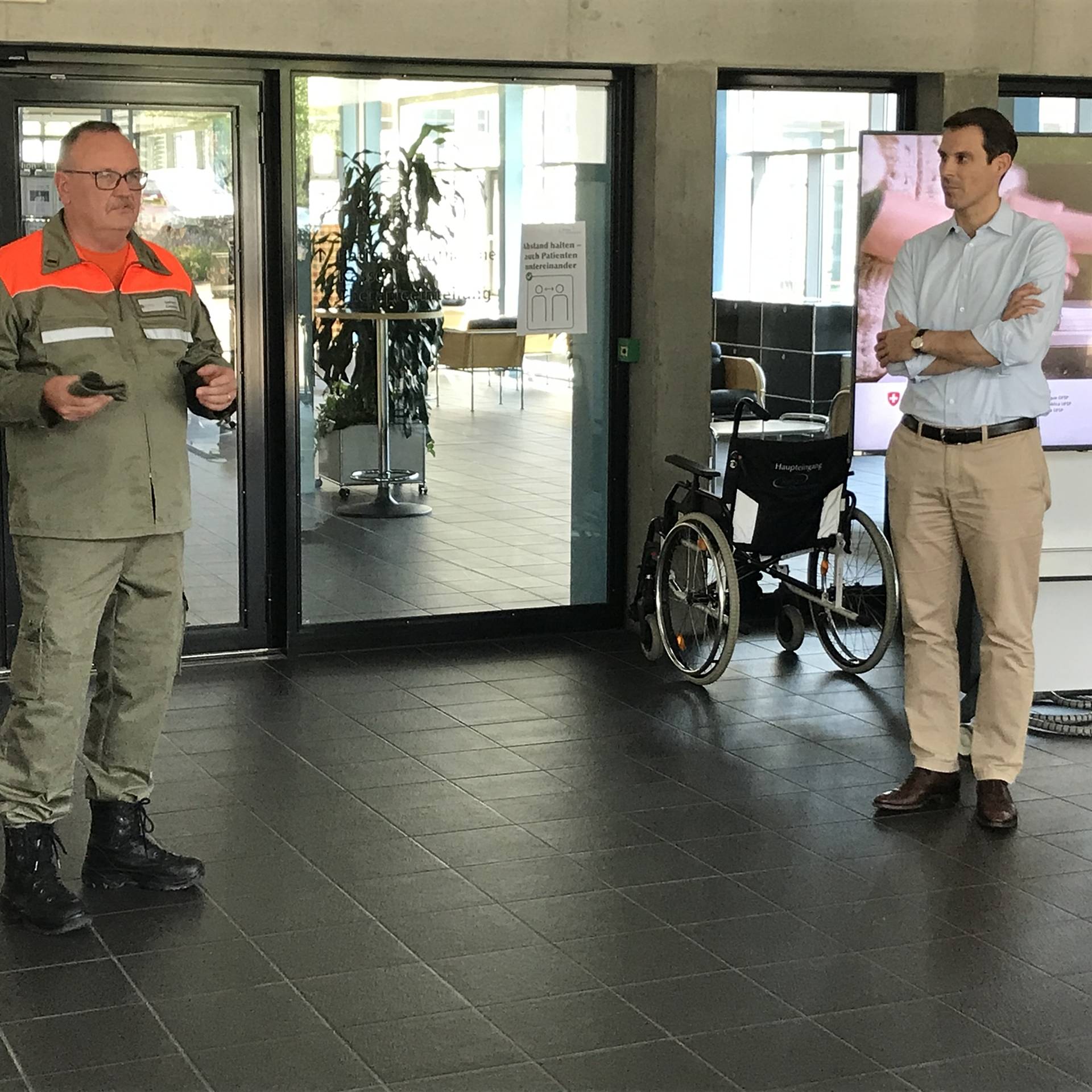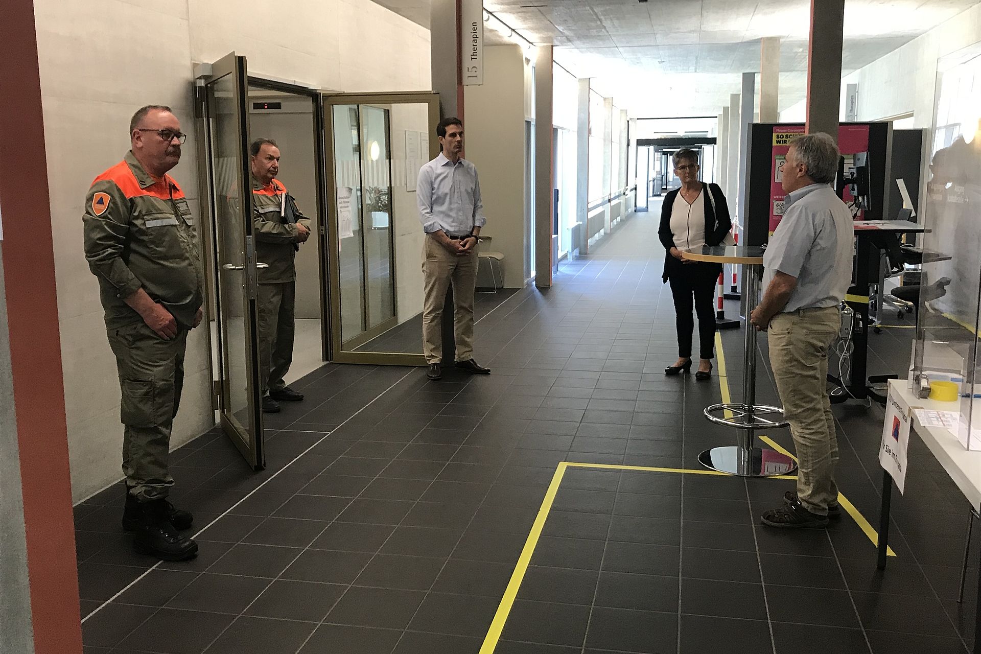 In der Reha wurde der hohe Gast durch den Direktor der Klinik Prof. Dr. Thierry Ettlin und den technischen Leiter Stephan Mahrer empfangen, welche die Arbeit der eingesetzten ZSO Unteres Fricktal speziell würdigten und der Politik für deren Ermöglichung den grossen Dank aussprach. In diesem Einsatz besorgen die Zivilschutzangehörigen die Eintrittskontrolle und die Patientenlenkung und organisieren den kontaktfreien Warenfluss zwischen Reha und Lieferanten. Abschliessend stand der Besuch im Spital Rheinfelden an. Auch in dieser Klinik betreuen die Zivilschützer die Eingangskontrolle und sorgen für die Umsetzung der Besuchs- und Eintrittsvorschriften. Thierry Burkart war beeindruckt von der erlebten Vielfalt im Einsatz und der Durchhaltefähigkeit des Zivilschutzes und sprach allen Einsatzformationen und Kadern seinen grossen Dank aus.