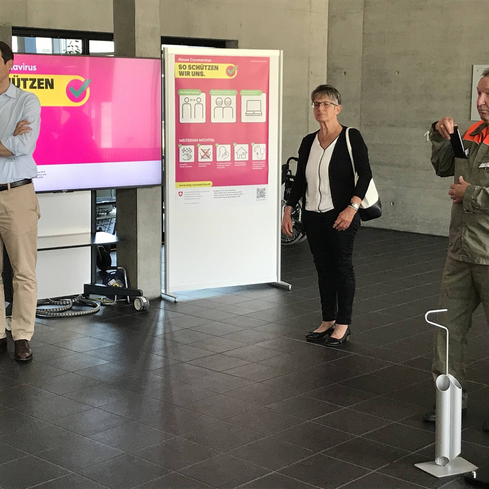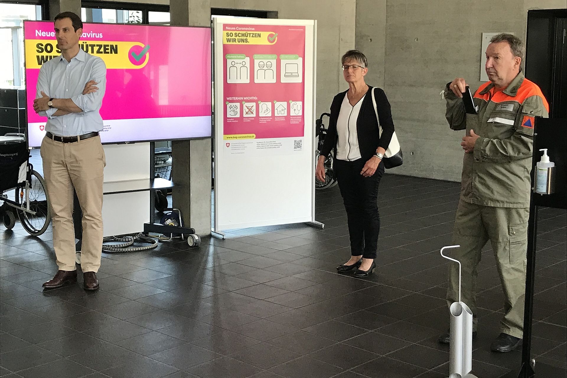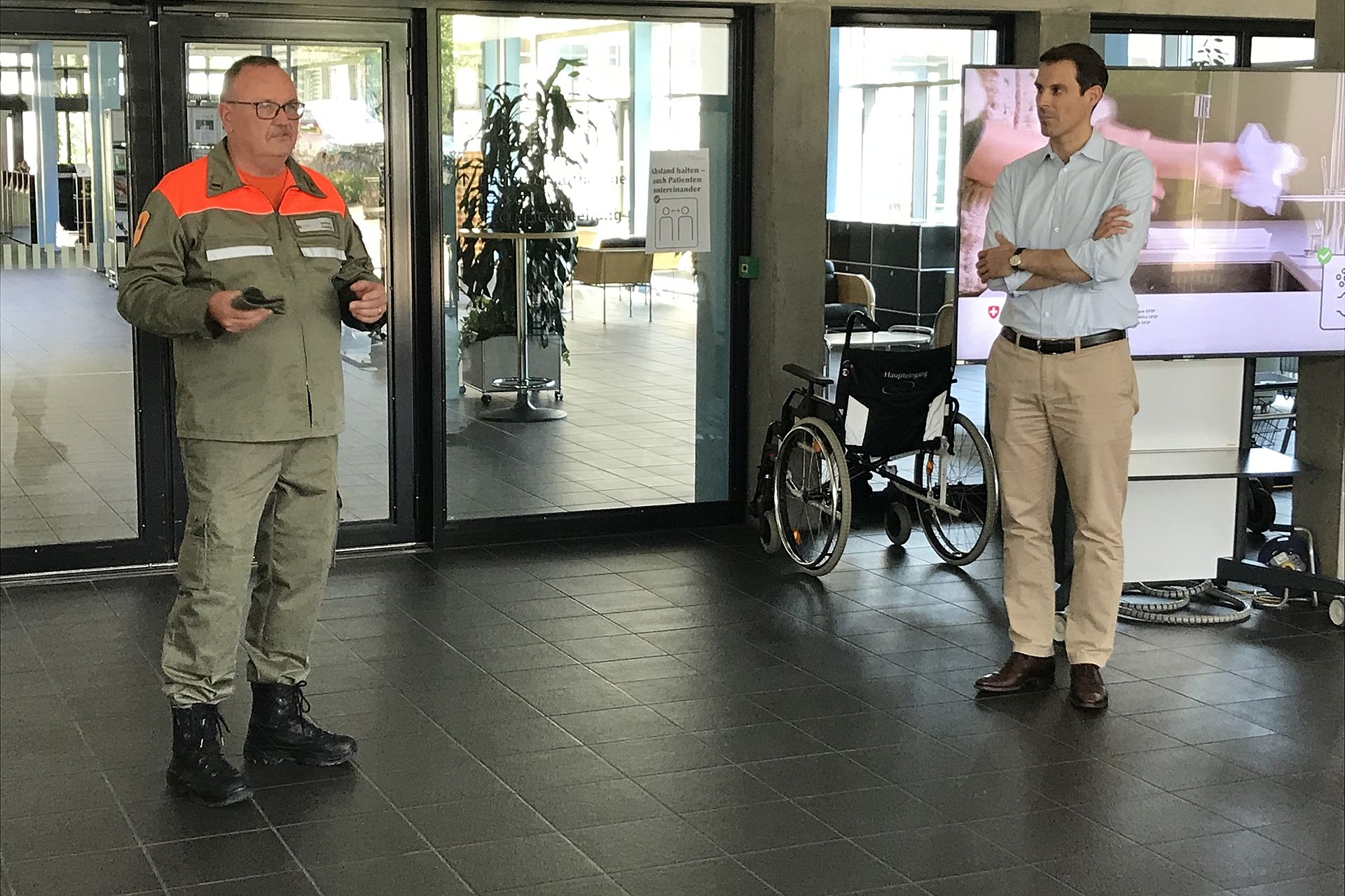 In der Reha wurde der hohe Gast durch den Direktor der Klinik Prof. Dr. Thierry Ettlin und den technischen Leiter Stephan Mahrer empfangen, welche die Arbeit der eingesetzten ZSO Unteres Fricktal speziell würdigten und der Politik für deren Ermöglichung den grossen Dank aussprach. In diesem Einsatz besorgen die Zivilschutzangehörigen die Eintrittskontrolle und die Patientenlenkung und organisieren den kontaktfreien Warenfluss zwischen Reha und Lieferanten. Abschliessend stand der Besuch im Spital Rheinfelden an. Auch in dieser Klinik betreuen die Zivilschützer die Eingangskontrolle und sorgen für die Umsetzung der Besuchs- und Eintrittsvorschriften. Thierry Burkart war beeindruckt von der erlebten Vielfalt im Einsatz und der Durchhaltefähigkeit des Zivilschutzes und sprach allen Einsatzformationen und Kadern seinen grossen Dank aus.