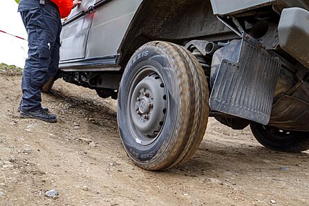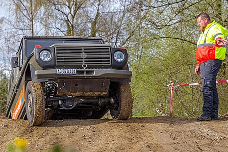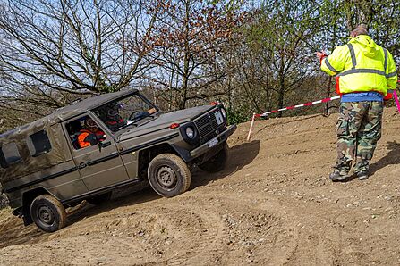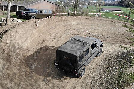 Im zweiten Teil wurde auf einem grossen Platz und unter der Anleitung von zwei ausgebildeten Fahrlehrern verschiedene Fahrmanöver geübt: Vom Fahren im Verbund, über unvorhergesehene Bremsmanöver, das Kurvenfahren oder die Unterschiede zwischen der Fahrt auf nasser und trockener Strasse wurden den AdZS nähergebracht. Das Schwierigste war aber wohl das Manövrieren mit Anhänger. Der dritte Themenschwerpunkt war das Fahren auf unwirtlichem Gelände – wobei unwirtlich fast verharmlosend klingt, wie ein Blick vor Ort zeigt: